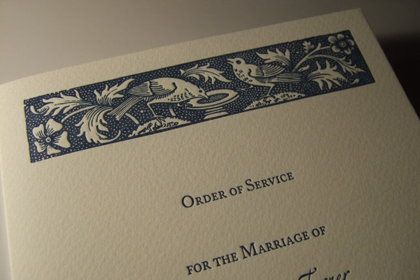 Wedding Order of Service printed pantone 541 on somerset white 100% cotton, 300gsm