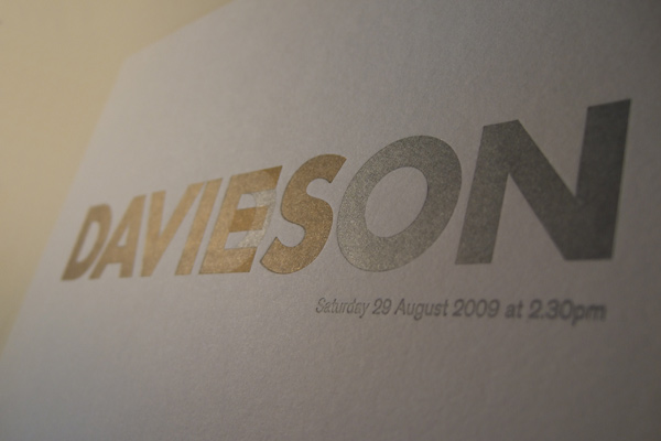 Wedding Stationery printed pantones 877 & 871on 540gsm bright white colorplan - Davies/Davidson merger